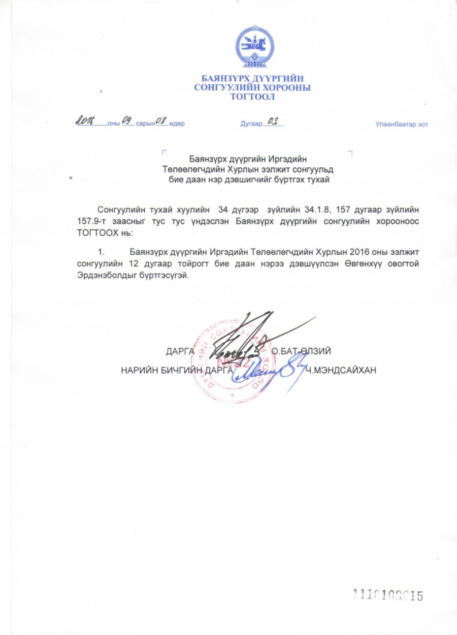 Баянзүрх дүүргийн ИТХ-ын ээлжит сонгуульд бие даан нэр дэвшигчийг бүртгэх тухай.
