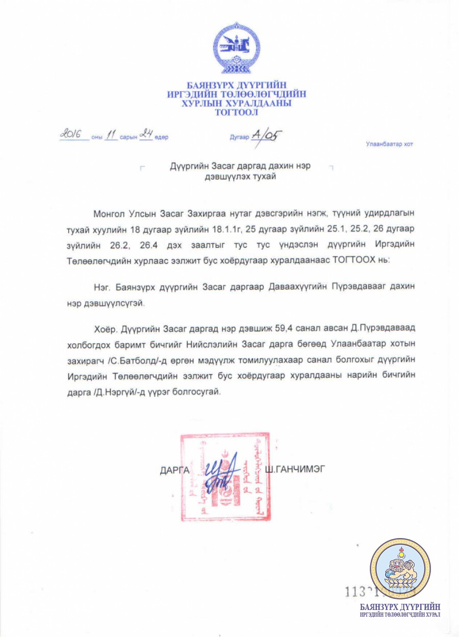 Дүүргийн Засаг даргад дахин нэр дэвшүүлэх тухай