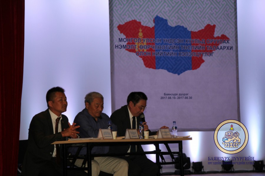 Монгол Улсын Их Хурлын 2017 оны “Монгол Улсын Үндсэн хуульд нэмэлт, өөрчлөлт оруулах асуудлаар ард түмний бүрэн эрхт байдал, оролцоог хангах тухай” 39 дүгээр тогтоолыг хэрэгжүүлэх ажлын хүрээнд Баянзүрх дүүргийн Иргэдийн Төлөөлөгчдийн Хурлын Тэргүүлэгчдийн 2017 оны A/28 дугаар тогтоолоор Баянзүрх дүүргийн хэмжээнд хэлэлцүүлгийг зохион байгуулах ажлын хэсгийг байгуулж уг хэлэлцүүлгийг дүүргийн Соёлын ордонд 2017 оны 08 дугаар сарын 11-ны өдөр амжилттай зохион байгууллаа.