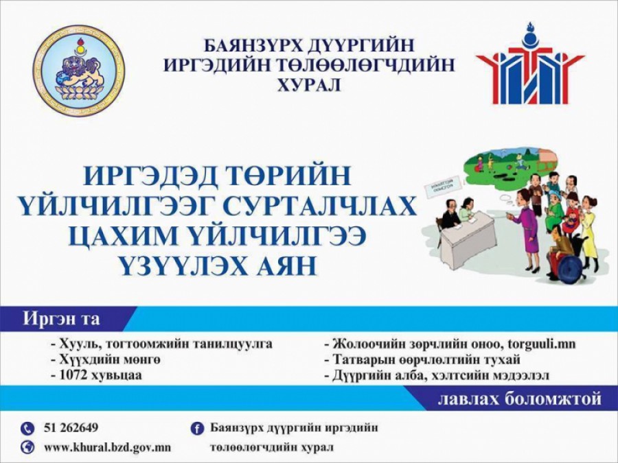 Баянзүрх дүүргийн иргэдэд төрийн үйлчилгээг ойртуулах, хялбаршуулсан байдлаар цахим хэлбэрээр төрийн үйлчилгээг хэрхэн авч болох талаар сурталчлах, дүүргийн Иргэдийн Төлөөлөгчдийн хурал болон Иргэний танхимын үйл ажиллагааг танилцуулах зорилгоор Иргэдийн хурлын Ажлын албанаас Татварын хэлтэс, Нийгмийн даатгалын хэлтэс, Хөдөлмөр, халамж үйлчилгээний хэлтэс, Эрүүл мэндийн нэгдэл гэх мэт харъяа хэлтэс албадуудтай хамтран явуулын иргэний танхимын үйлчилгээг 28 хороондоо эхлүүллээ.