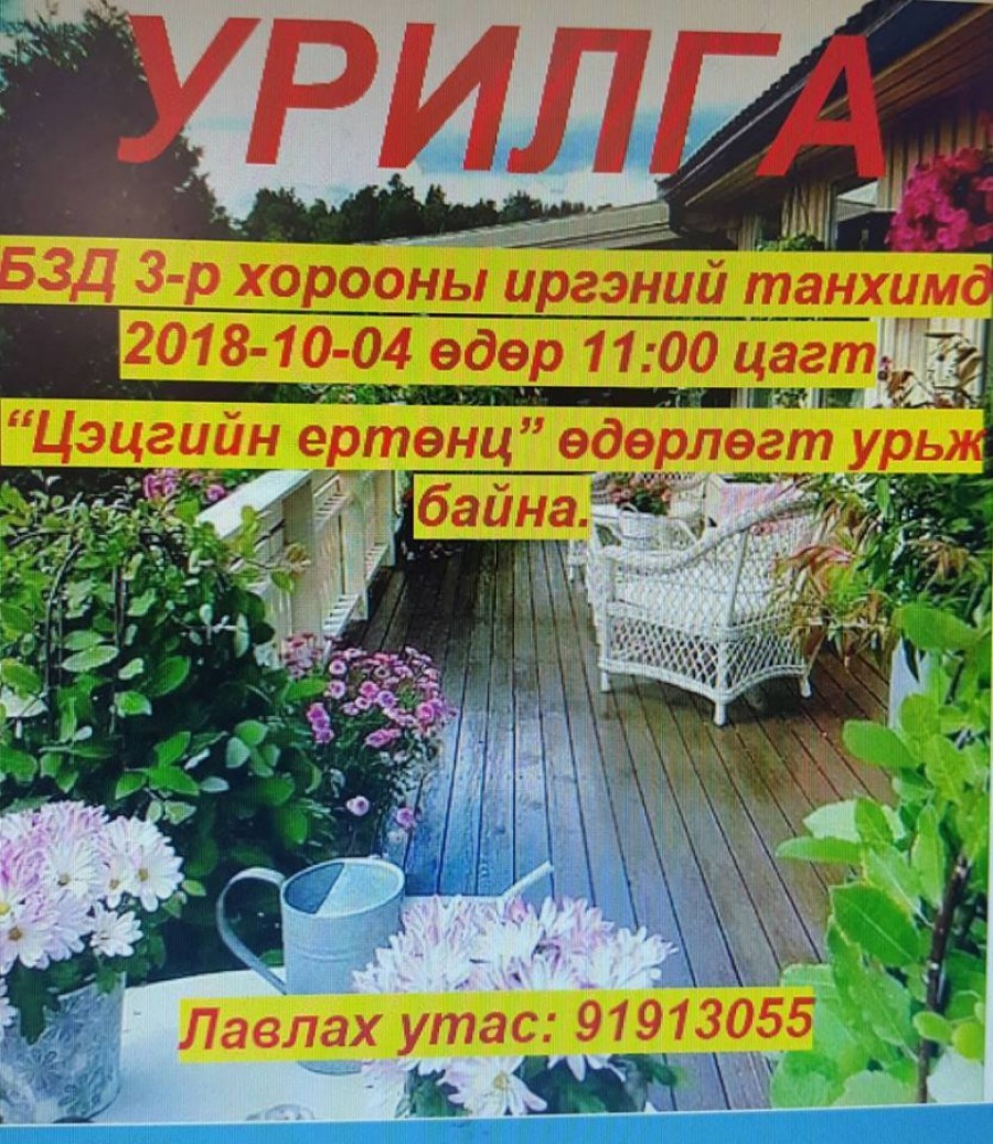 2018 оны 10 дугаар 04-ны өдөр 3 дугаар хорооны Иргэний танхимд тус хорооны Сургалт, сурталчилгаа хариуцсан зохион байгуулагчийн санаачлагаар      “Цэцгийн ертөнц” өдөрлөгийг зохион байгууллаа.