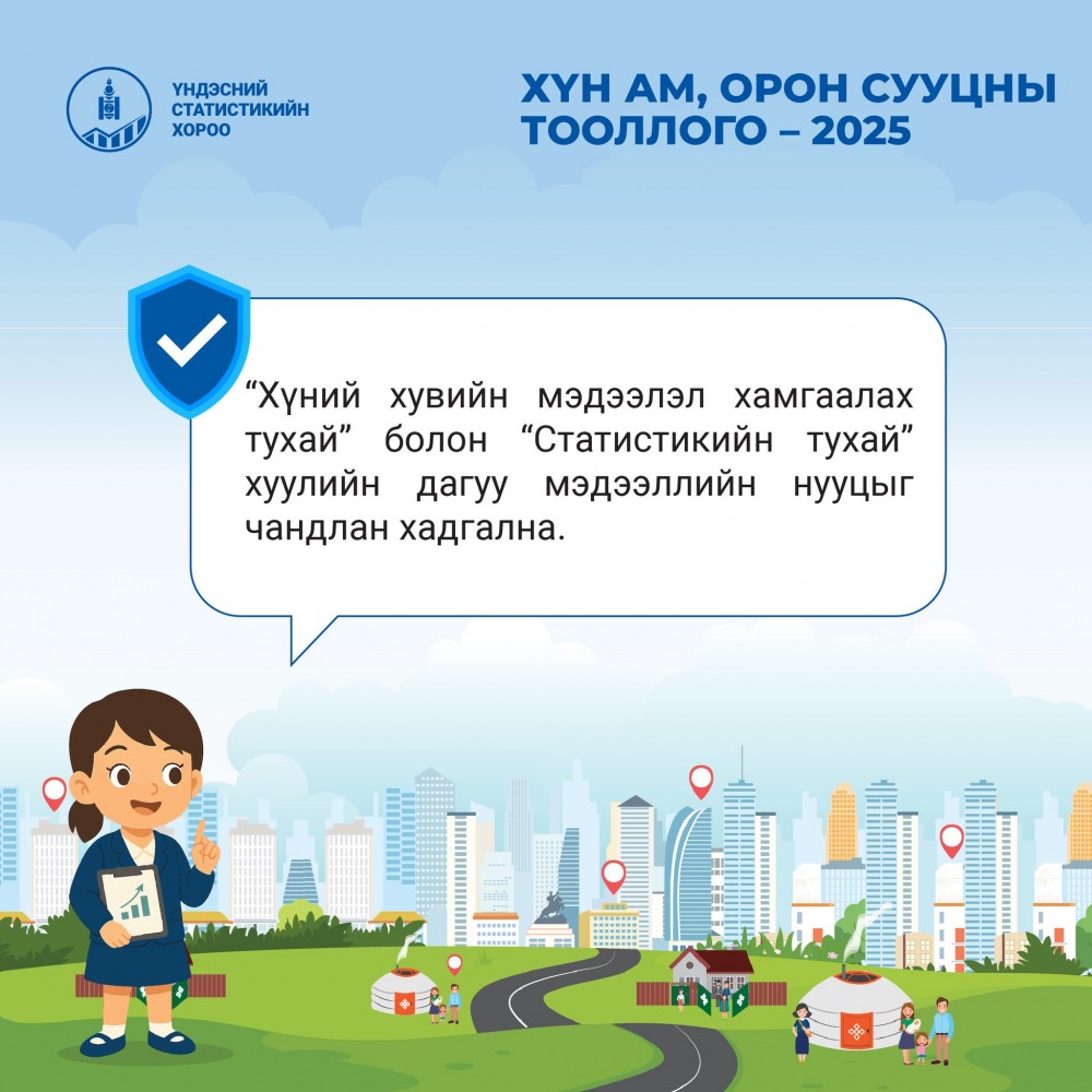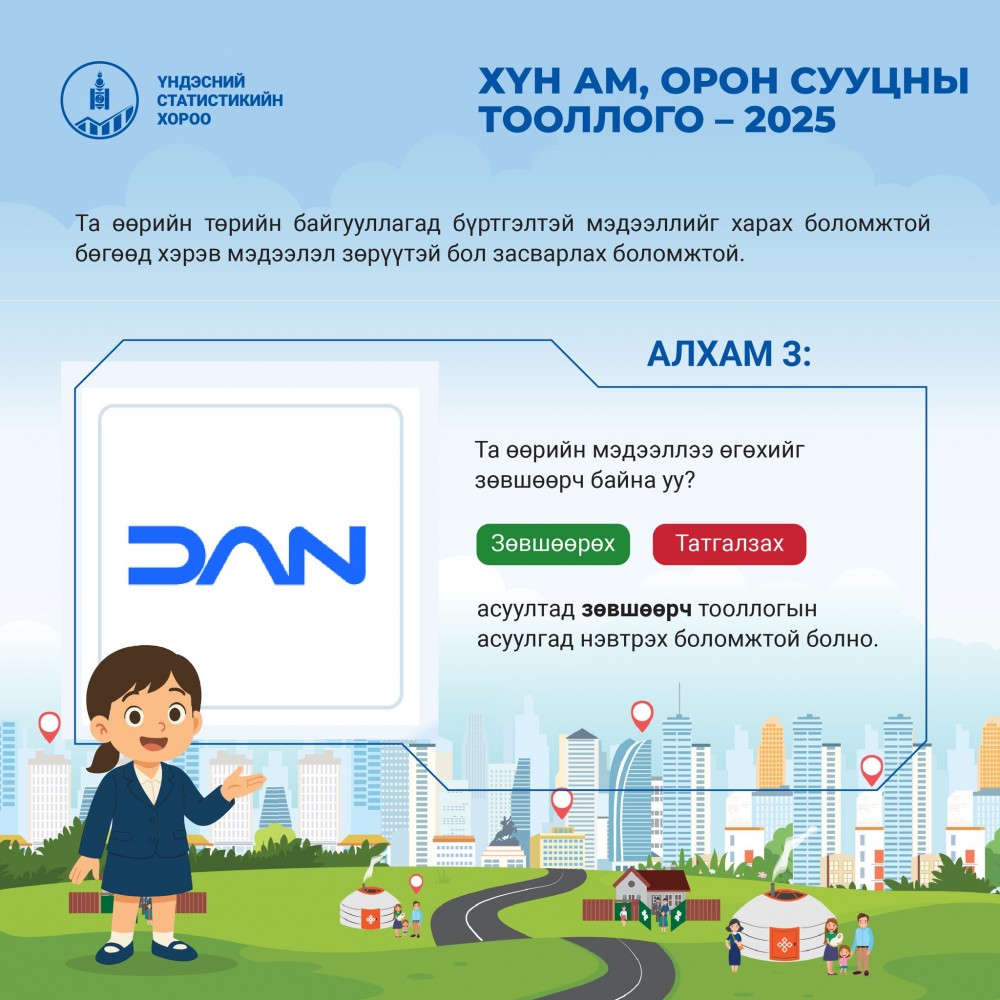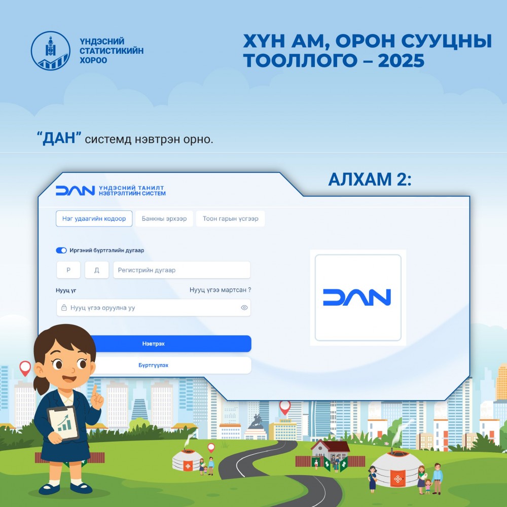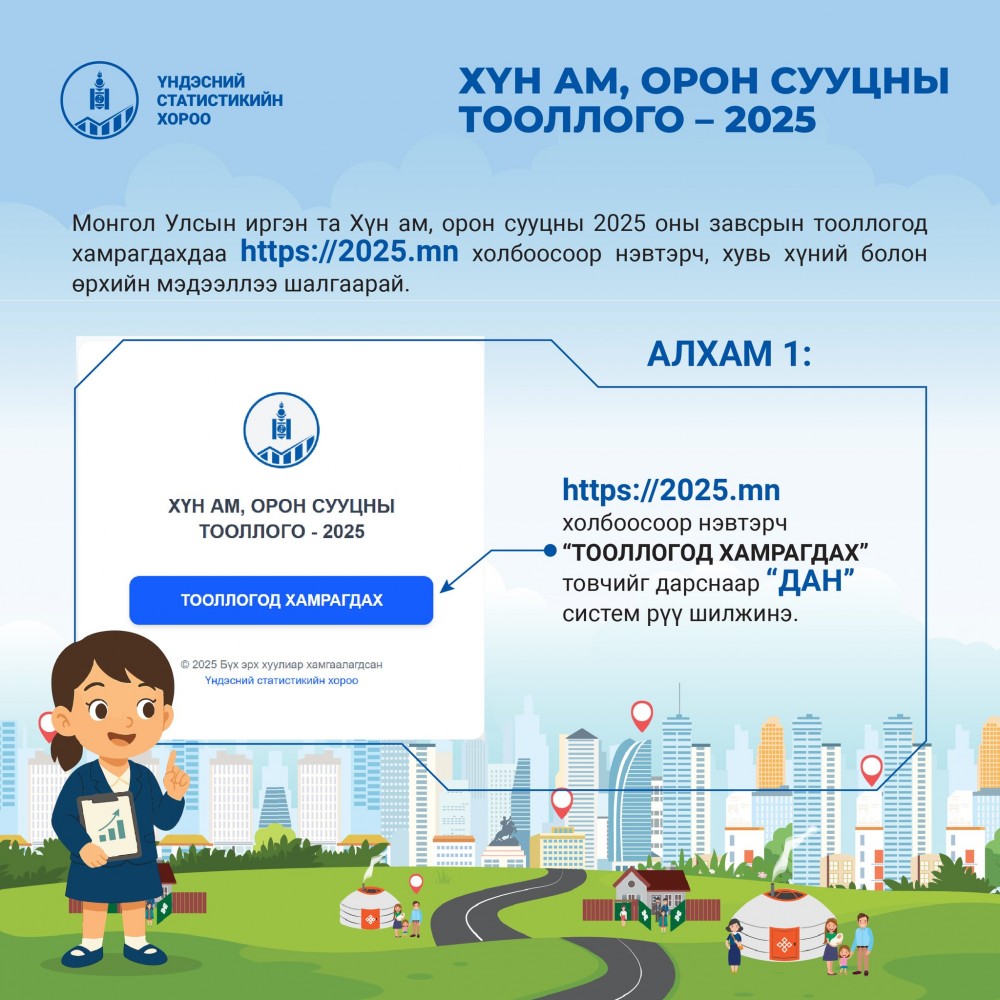 Монгол Улсын иргэн та Хүн ам, орон сууцны 2025 оны завсрын тооллогодоо идэвхтэй хамрагдаарай.
