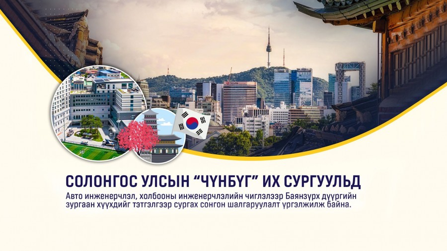 Солонгос улсын "Чүнбүг" их сургуульд суралцах тэтгэлэг зарлалаа. 2024/08/05 Солонгос улсын Чүнбүг их сургуульд авто инженерчлэл, холбооны инженерчлэлийн чиглэлээр Баянзүр…