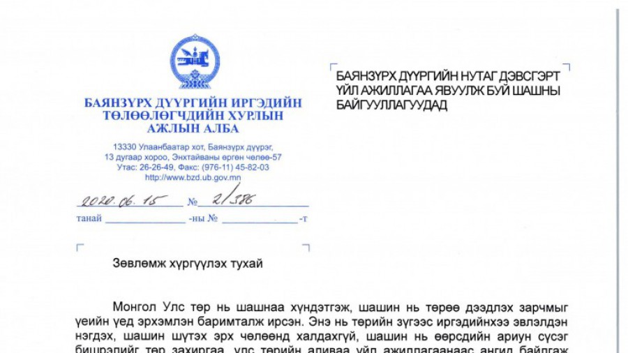Баянзүрх дүүргийн Иргэдийн төлөөлөгчдийн хурлаас нутаг дэвсгэрт шашны үйл ажиллагаа явуулж буй сүм хийдүүдэд дараах Зөвлөмжийг хүргүүлж байна. 2020/06/18